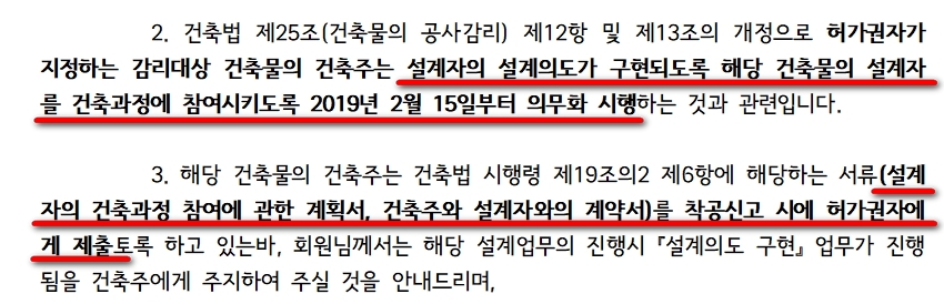2019년 2월 15일부터 개정 건축법 제25조(법률 제15721호, 2018.8.14.)에 따라 허가권자가 감리자를 지정하는 건축물의 경우, 설계 및 감리업무 외에 설계자의 설계의도구현 업무가 의무적으로 수행되도록 착공신고...