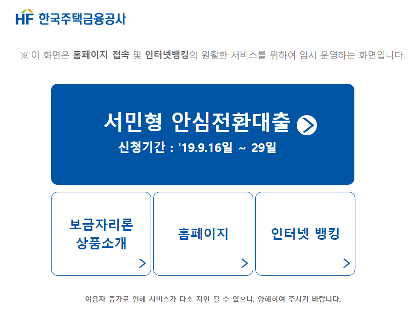 서민형 안심전환대출 신청접수는 2019.9.16일 ~ 2019.9.29일까지입니다. 신청접수 기간 종료 이후 공사에서 낮은 주택 가격 순으로 심사 대상자를 선정하여, 선정된 분에 대해서만 대출심사를 진행하오니 이 점 꼭 유념하여 주시기 바랍니다. 실제 대출 가능여부 및 대출금액은 LTV · DTI · 신용정보 등 추가 요건을 고려하여 결정 됩니다.