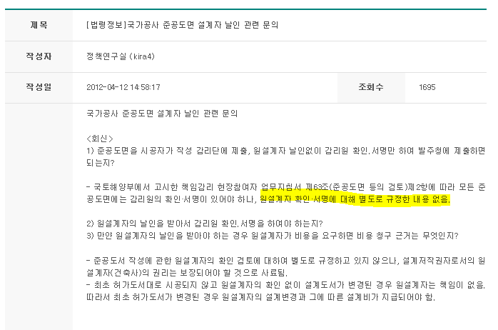 설계자가 현장 감리자로 지정되기 어려운 상황에서는 다시 한 번 짚어보아야 할 부분이 되는 것 같습니다.