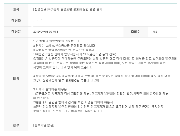 대한건축사협회의 민원상담에도 이와 같은 문제로 문의가 들어와 있습니다.