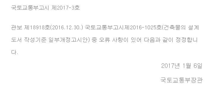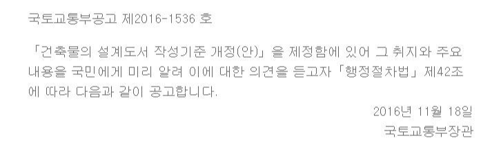 국토교통부공고 제2016-1536 호 「건축물의 설계도서 작성기준 개정(안)」을 제정함에 있어 그 취지와 주요 내용을 국민에게 미리 알려 이에 대한 의견을 듣고자「행정절차법」제42조에 따라 다음과 같이 공고합니다. 2016년 11월 18일 국토교통부장관