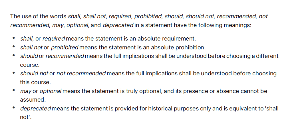 이건 해도되고 이건 할수 없고 해야하고 해서는 안되고 등의 필요사항에 강약을 이 있음을 알려줍니다.
