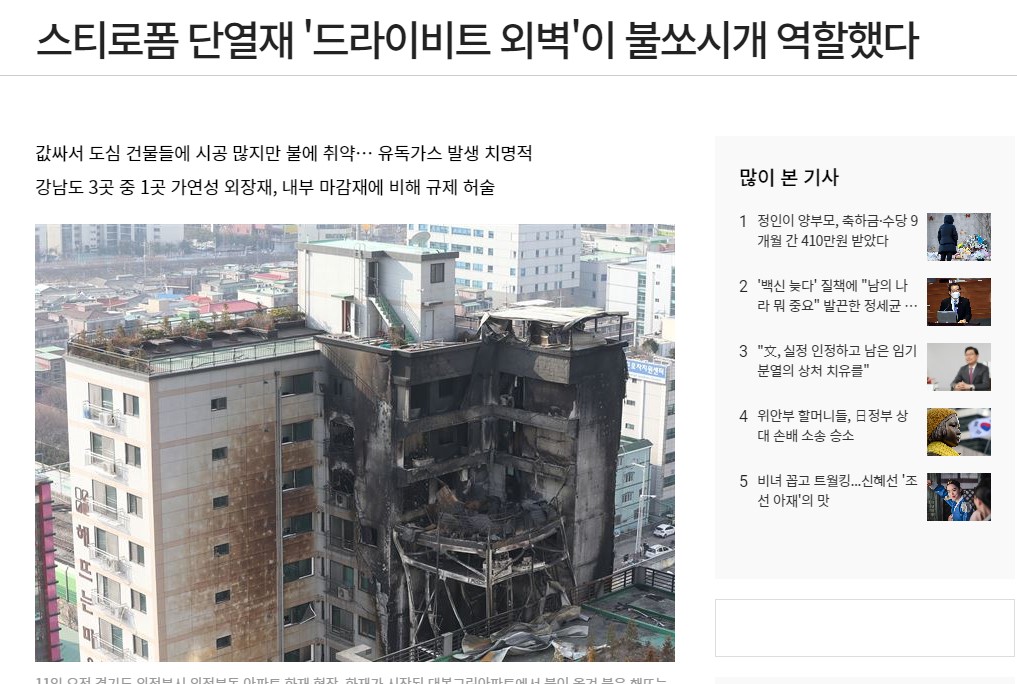 건축물의 화재사고가 특정 제품(공법)으로 인해 시작되거나 규모가 커지는데 원인이 되었다면서 자극적인 기사들이 나오기도 합니다.