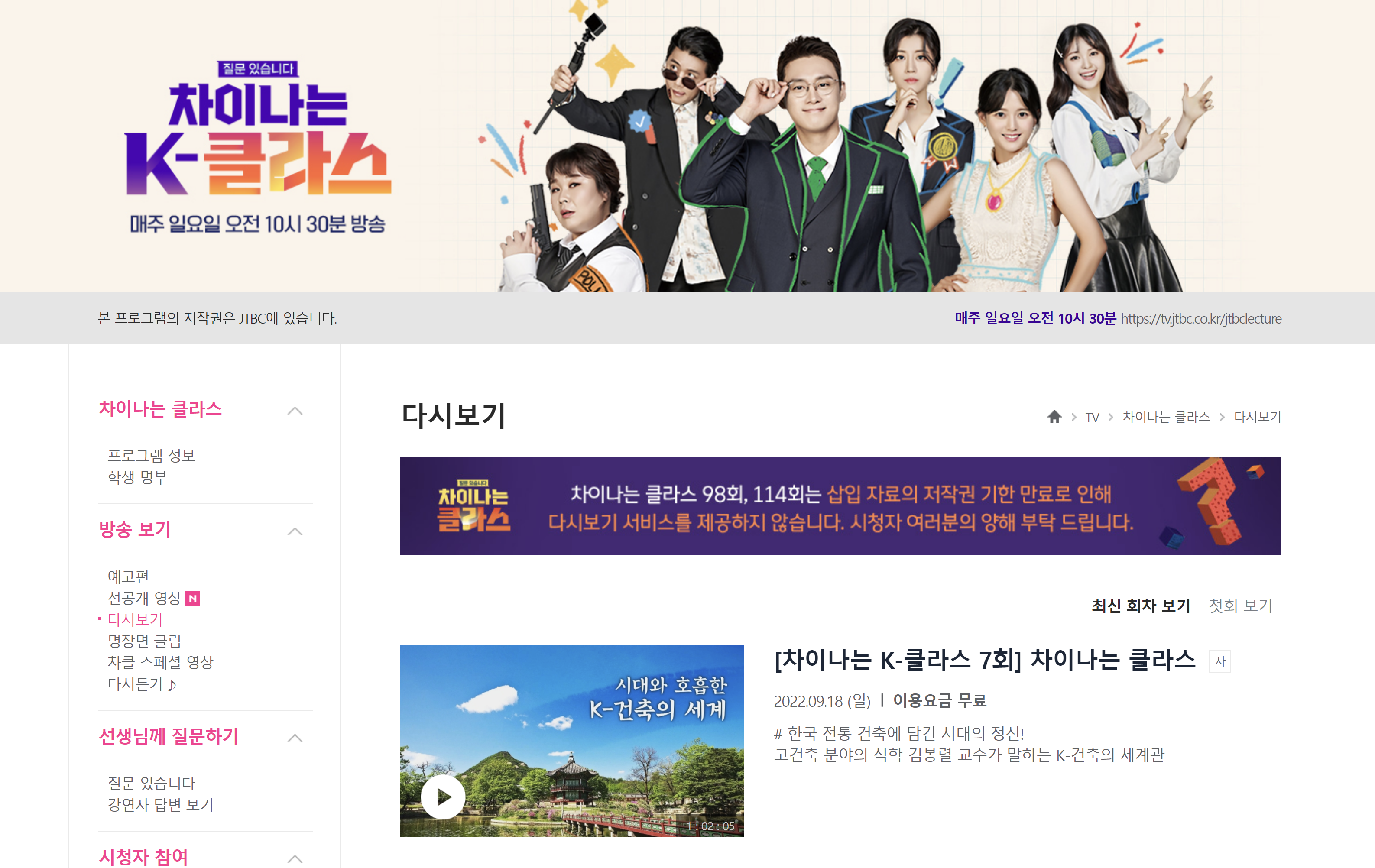 차이나는 클라스 98회, 114회는 삽입 자료의 저작권 기한 만료로 인해 다시보기 서비스를 제공하지 않습니다. 시청자 여러분의 양해 부탁 드립니다.