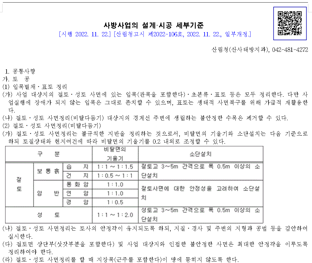 또한 비탈면 설계기준 에 대한 사항들이 있는데