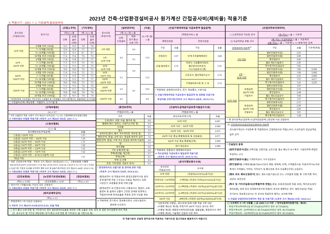 - 산재·고용보험료율 등 법정 간접공사비(제비율(고시 등)) 내용은 해당 부처(국토교통부, 고용노동부 등)에 문의