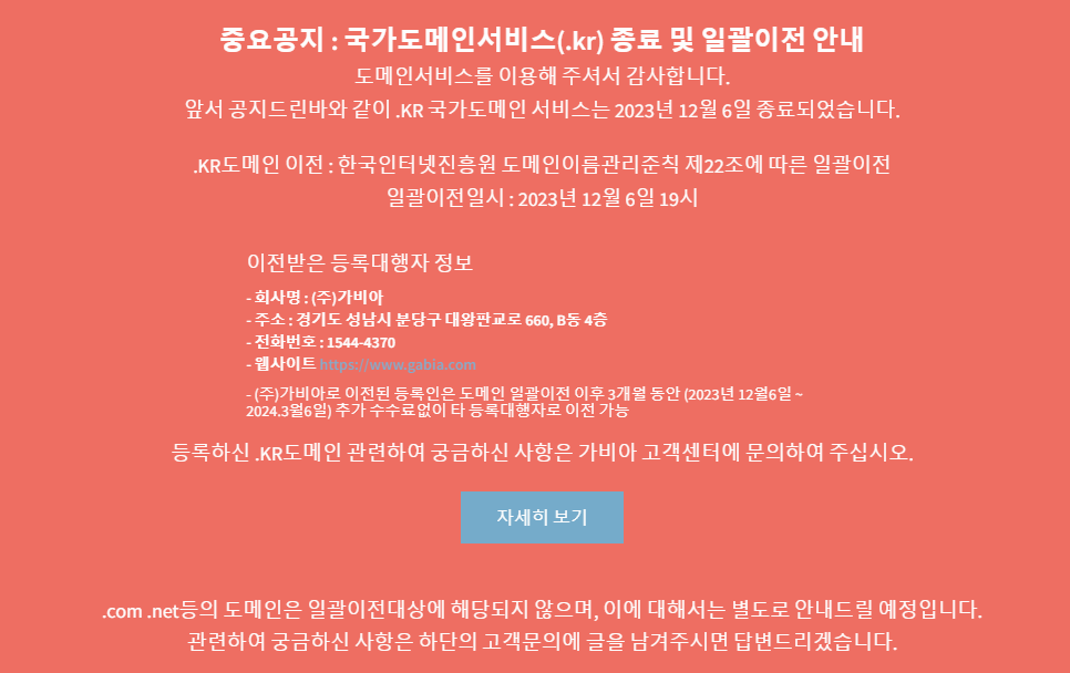 한국전자인증 네임서버(ns1.ccdomain.co.kr, ns2.ccdomain.co.kr) 이용 중인 고객은 네임서버 운영종료유예기간 (2024년 2월 29일까지) 내에 도메인의 네임서버 정보를 가비아 네임서버로 변경한 후DNS 레코드를 등록하여야 웹사이트 접속 차단, 메일서비스 중단 등의 장애를 방지하실 수 있습니다.